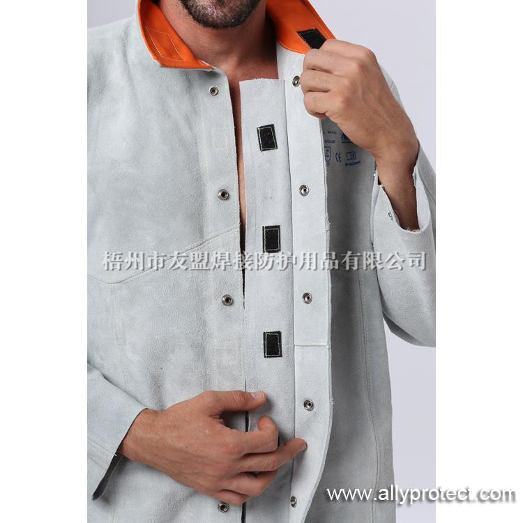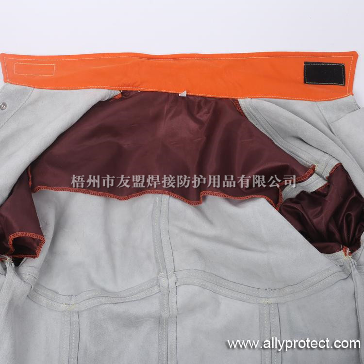 前胸防護條設計,防止燒焊飛濺物濺入衣內(nèi),雙層皮設計防止撕脫。